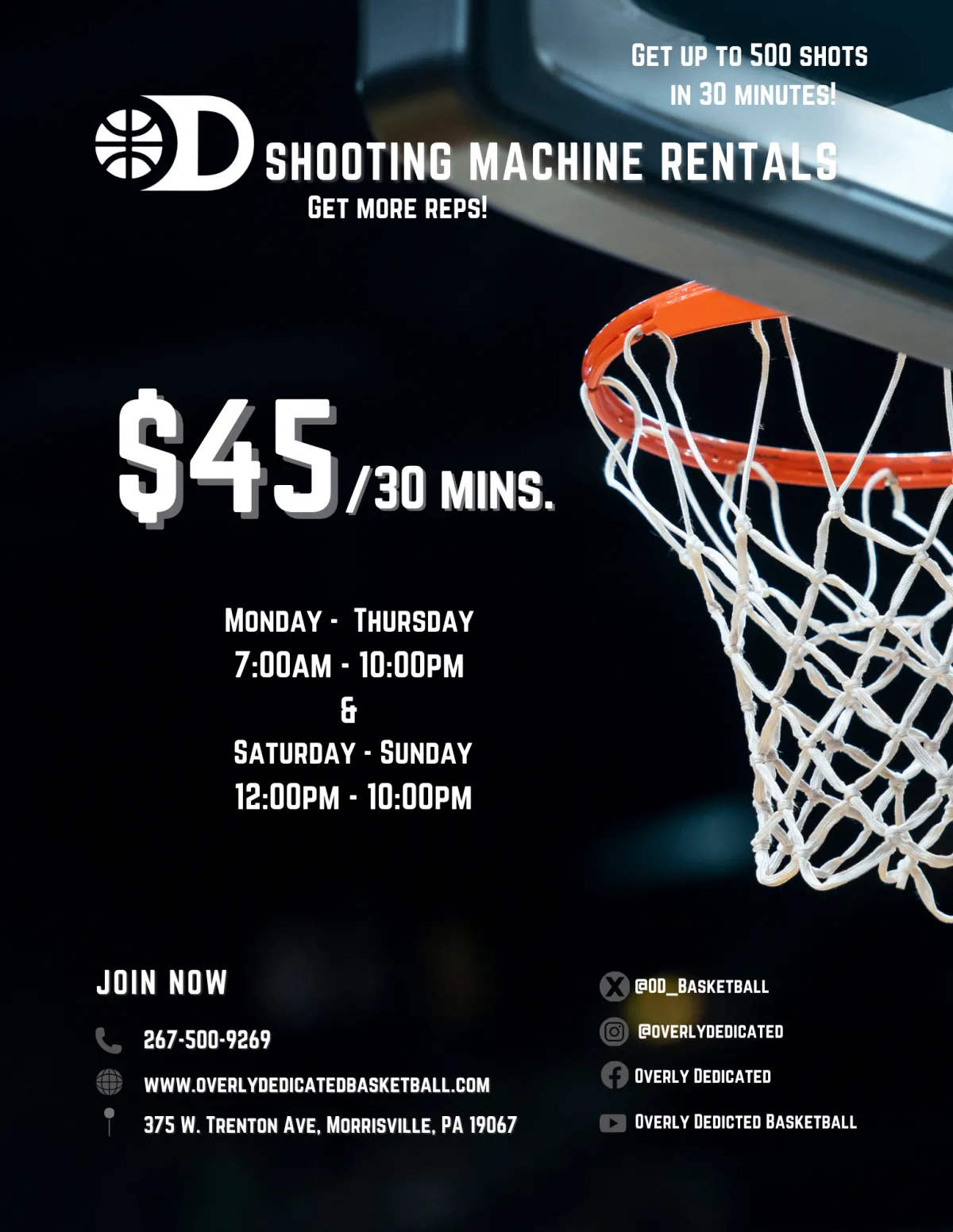 Reserve a basket and use the "Dr. Dish CT" machine where players can shoot upwards of 500 shots in just 30 minutes. In addition to being an incredibly efficient way to get game-like repetition, it will also keep track of your stats and progress as you shoot!